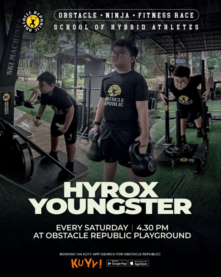 is a junior version of the HYROX fitness race, designed specifically for kids and teenagers to experience the same excitement and challenge of a real HYROX event — but scaled to suit their age and ability levels.